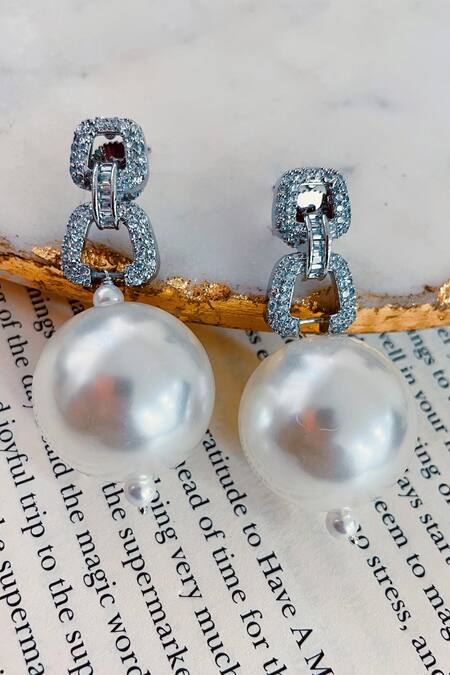 Silver tone stone embellished interlink earrings crafted in brass with a pearl drop