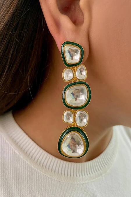 Emerald statement necklace featuring five layers of Kundan Polki stones. Paired with a matching pair of earrings designed with semi-precious stones.