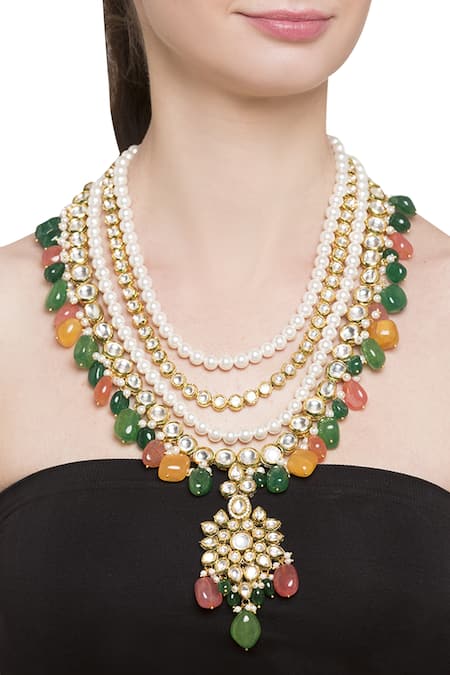 18k gold kundan necklace featuring multiple strands adorned with colorful beads