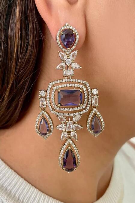 Purple necklace featuring three layered design with semi-precious stones. Paired with matching earrings and maangtikka, crafted in brass.