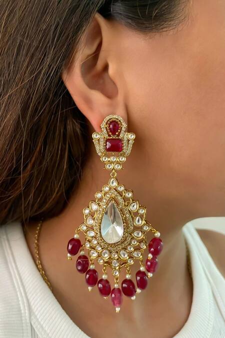 Handmade with semi-precious stones, Intricate polki and kundan work, Drop earrings with ruby embellishments