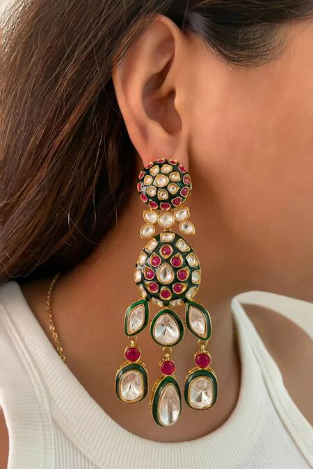 Handmade design with semi-precious stones, Intricate polki and kundan work, Drop earrings with matching maangtikka