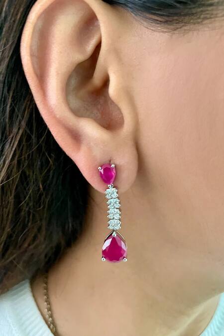 Teardrop ruby pendant on the necklace, Earrings with cascading diamond stones, Intricate design on the ring with a large ruby