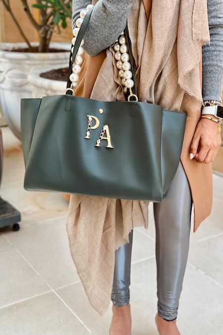 Olive green tote bag crafted from vegan leather featuring stone embellishments and custom initials