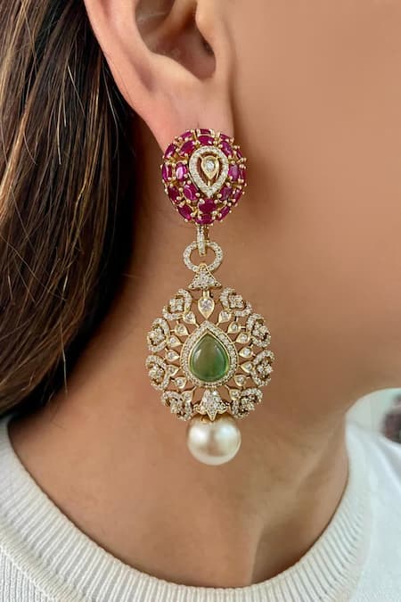 Ruby pink necklace featuring emerald tear drop and pearl embellishments. Paired with matching earrings adorned with semi-precious stones.