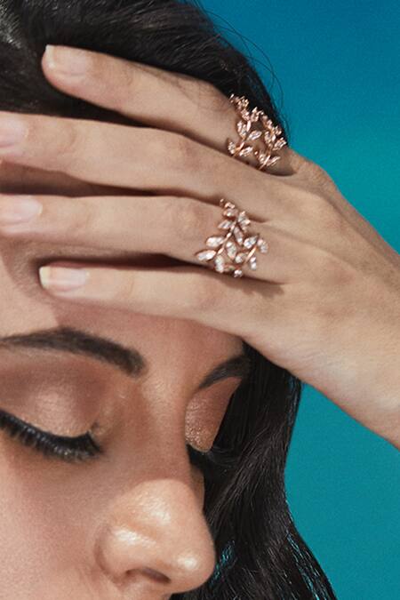 Intricate spiral design with leaf motifs, Encrusted with Swarovski crystals, 18k rose gold plating