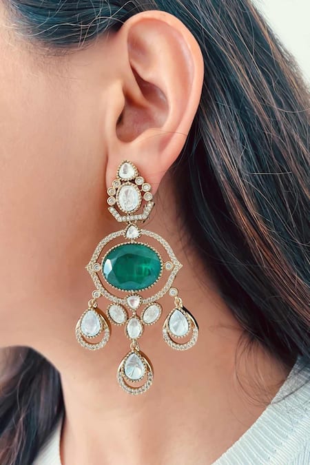 An emerald green choker necklace crafted from brass, featuring emerald doublets and moissanite stones in a handmade design. Paired with coordinating chandelier earrings.