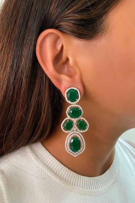 Silver toned three layered necklace embellished with emerald stones. Paired with matching earrings featuring emerald stone accents.