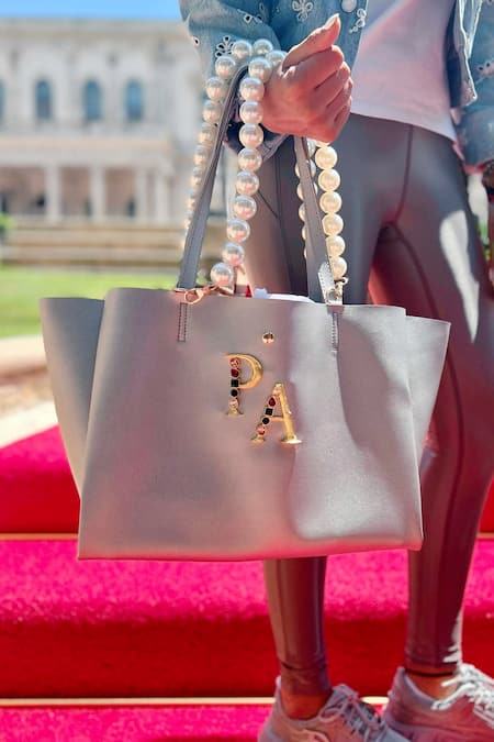 Light grey vegan leather tote bag featuring stone embellishments and custom initials