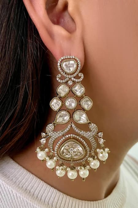 White Pearls, Diamonds Victorian Poppy Polki Kundan Drops Set