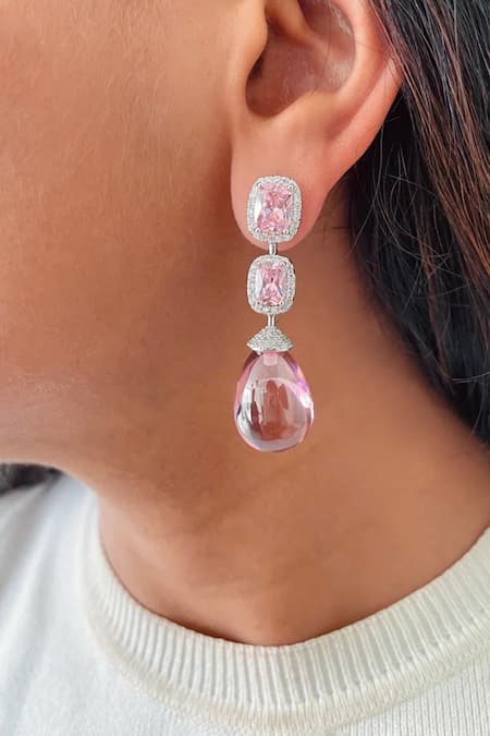Large pink cushion-cut central stone, Delicate zircon detailing, Matching drop pendant earrings