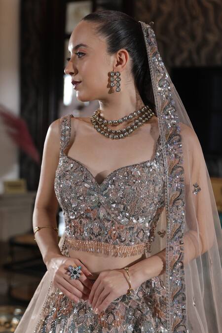 Crystal tasselled hem on blouse, All over hand embroidery work, Dupatta with sequins and crystal work
