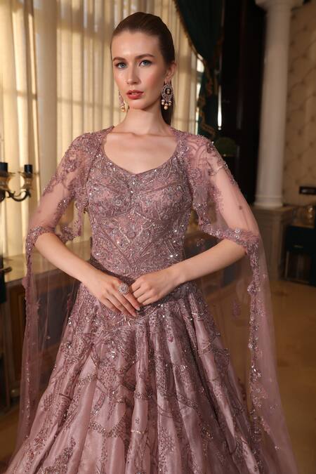 Pink flared gown featuring cutdana, sequin, thread, and bead embroidery in a floral pattern. Comes with a separate cancan and a detachable embroidered cape.
