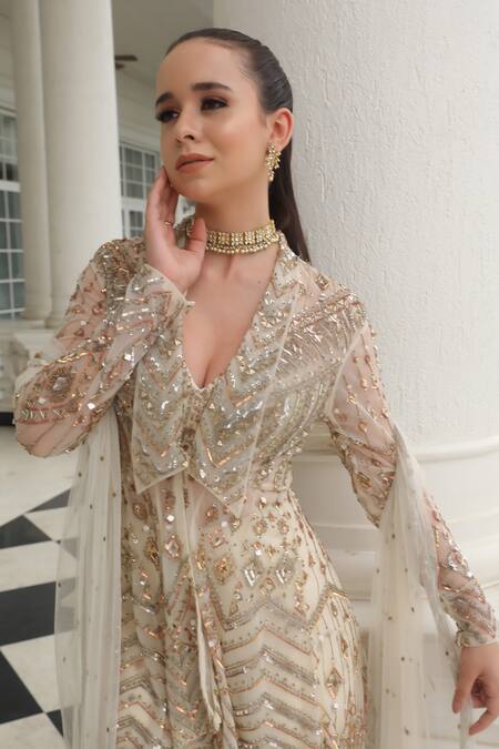 Ivory kurta featuring shawl collar, full sleeves, and back cut-out detailing. Paired with a sharara and a dupatta adorned with sequins and crystal hand embroidery.