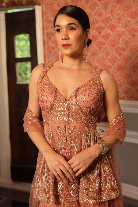 Buy_Presto Couture_Pink Net Sequins, Crystals, Beads Hand Embroidered Backless Kurta Sharara Set _Online_at_Aza_Fashions