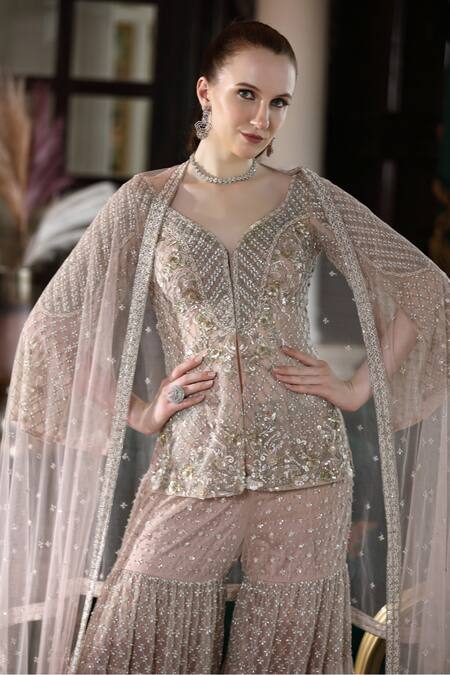 Buy_Presto Couture_Pink Net Sequins, Crystals Polo Collar Hand Embroidered Short Kurta Sharara Set _Online_at_Aza_Fashions