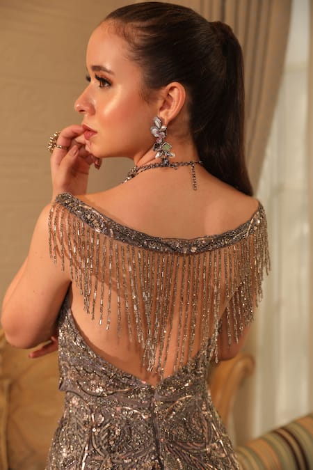 Crystal tassel detailing at the back, Metallic sequin and bead embroidery, Waist cut-out design