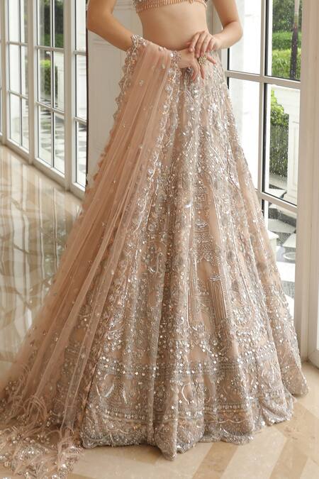 Beige lehenga featuring intricate hand embroidery with sequins and crystals. Paired with a padded blouse and a dupatta adorned with sequins and crystal work.
