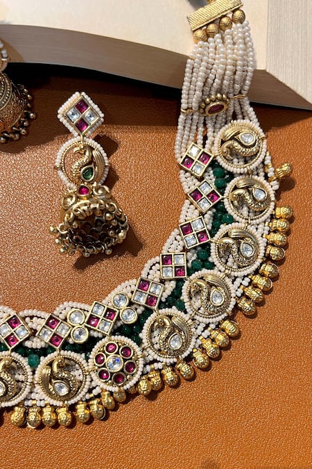 Gold finish with intricate bead work, Matching earrings with similar embellishments