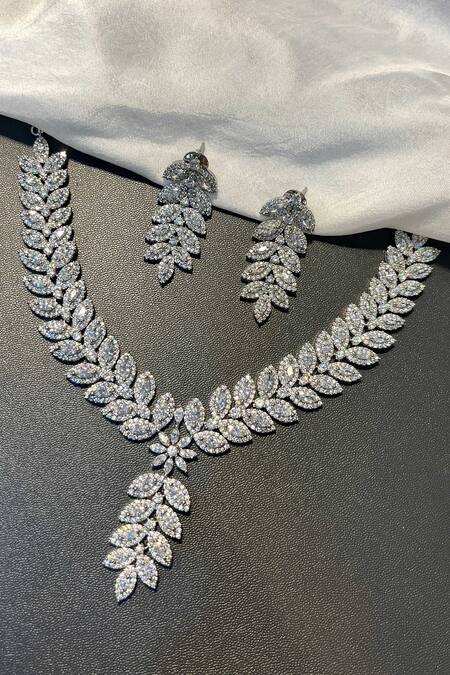 White finish leaf carved choker featuring zirconia embellishments. Paired with matching earrings that complement the choker design.