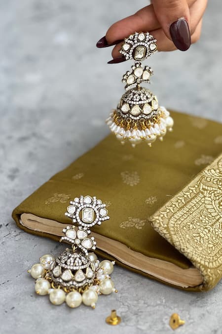 Antique finish jhumkas featuring white polki embellishment and pearl drops