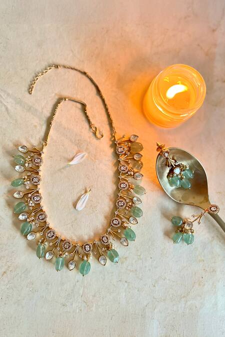 Green necklace featuring Kundan and Polki stones with a gold finish. Paired with matching earrings adorned with similar stone details.