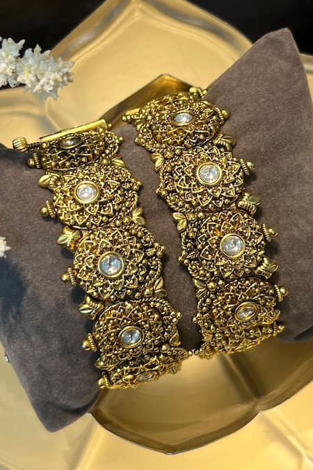 Gold Plated Crystals Temple Broad Bangles - Set Of 2