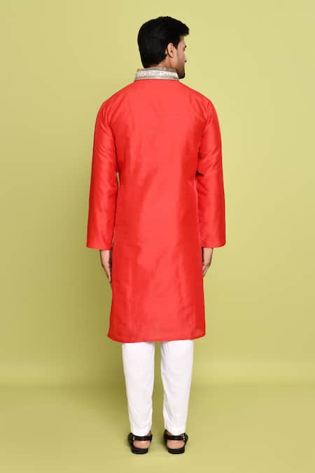 Red kurta featuring stone hand embroidery on the collar and front loop buttons. Paired with solid white pant with a semi-elastic waistline.