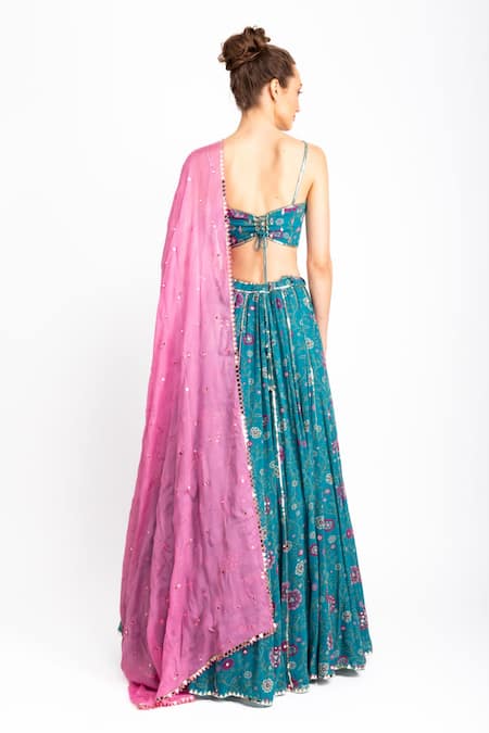 Teal georgette lehenga with attached can-can, logo print, mirror & sequin work details. Paired with cut princess cut padded blouse with hand embroidery & pink dupatta.