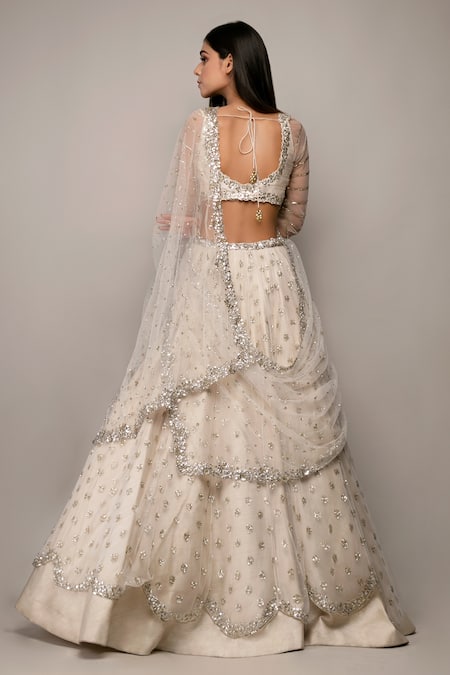 Ivory net & silk double layered lehenga with attached can-can, zardozi & sequin booti pattern embroidery. Paired with silk padded leaf neck blouse with embroidered cut work hem & net embroidered dupatta.
