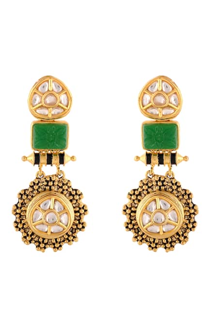 Gold toned long necklace featuring jaali chain, floral & bird brooches, carved green stone, pendant drop & kundan, pearl embellishments. Paired with matching dangler earrings.