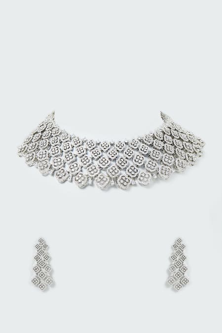 Rhodium toned floral necklace embellished with cubic zircon diamonds. Paired with matching dangler earrings.
