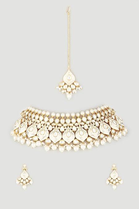 Gold toned choker necklace featuring white meena work, pearl drops, and kundan embellishments. Accompanied by a matching pair of earrings and a maangtikka.