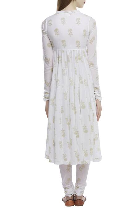 White all-over floral motif print detailed anarkali. Comes with matching churidar & beige chanderi gota worked dupatta.