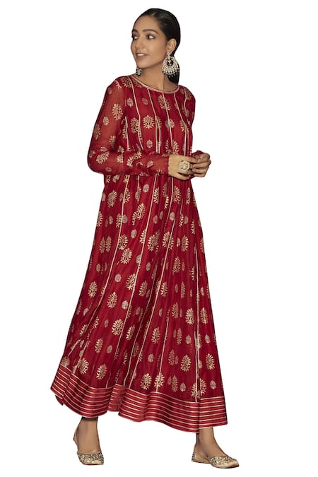 Buy_Sue Mue_Red Lycra Crepe, Maheshwari Cotton Round Printed Anarkali Set _at_Aza_Fashions