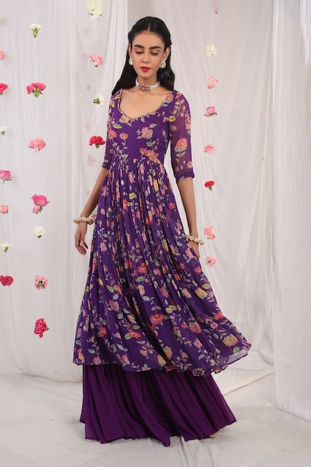 Buy_Esha Koul_Purple Organza, Georgette, Semi Crepe Floral Motifs Printed Anarkali Sharara Set_at_Aza_Fashions
