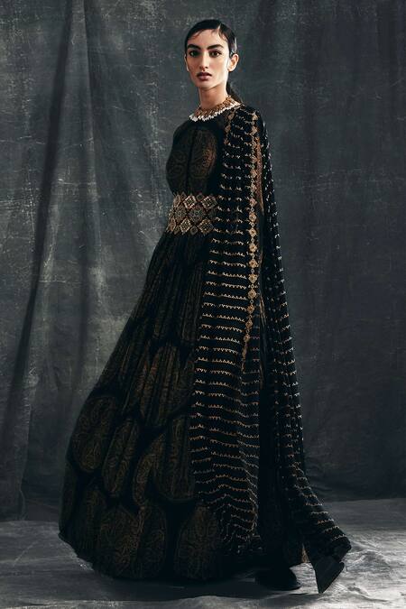 Black anarkali with gold ambi circle print all over paired with handcrafted thread-pitta embroidered belt enhanced with mirror, emerald green stone embellishments. Comes with an attached nukta print dupatta.