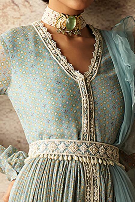 Powder blue anarkali with folk printed motifs, embroidered detail & gathered sleeves. Paired with ruffle dupatta & embroidered bead drop belt.