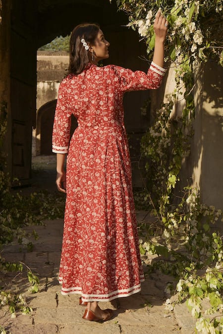 Maroon anarkali with floral block printed motifs, side tie-up & lace detail. Paired with kota doria dupatta.