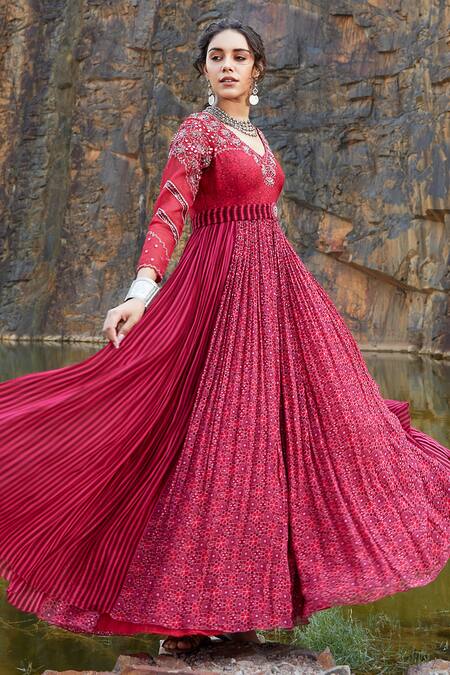 Wine & fuchsia anarkali with all-over printed motifs & embroidered yoke. Paired with a sheer dupatta & embroidered belt.