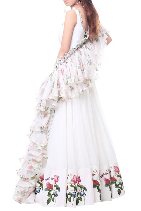 Crafted in luxe organza fabric and georgette, this white anarkali is an example of fine craftsmanship. The super flared design is enhanced with floral printed borders all around. This anarkali comes along with a flared ruffle dupatta to further add to the dramatic appeal.