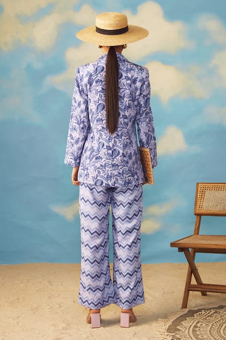 Purple tropical print blazer with a concealed front placket. Paired with printed wide-leg pant.