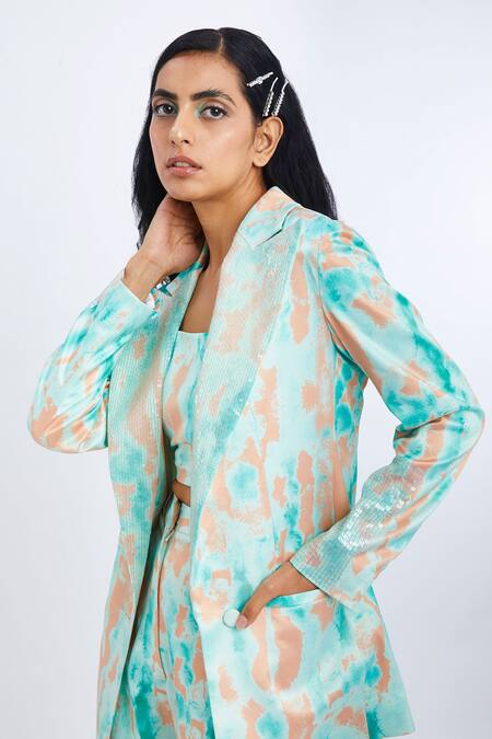 Mint green blazer with hand painted digital print detail & sequins embellished lapel, sleeves.
