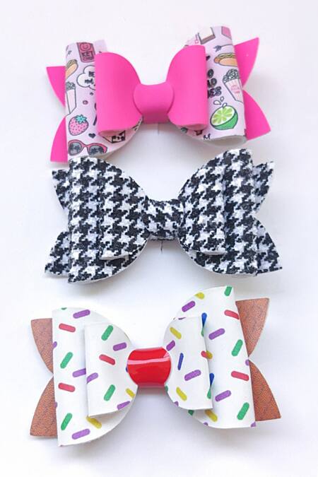 Multicolor bows with hot pink abstract pink bow, houndstooth bow and a sprinkle print bow.
