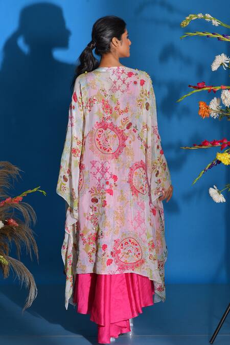 Hot pink asymmetric anarkali paired with kaftan style printed cape. Comes with pant.