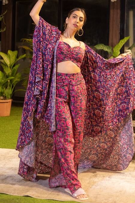 Buy_Mehak Murpana_Pink Crepe Zigzag Bustier Sweetheart Neck Printed Cape And Pant Set_Online_at_Aza_Fashions