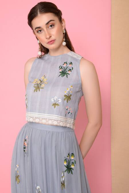 Blue crop top with floral motif work & lace trim hemline.
