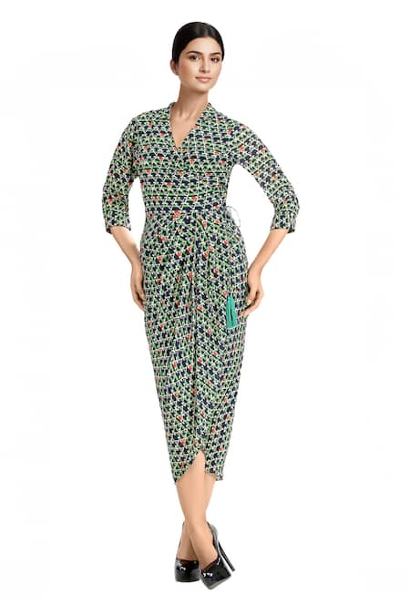 Buy_Soup By Sougat Paul_Blue Crepe V Neck Printed Drape Dress _Online_at_Aza_Fashions