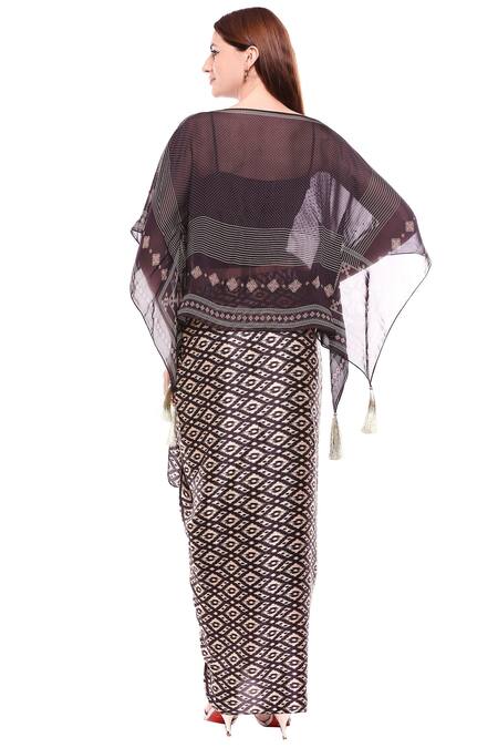 Brown kaftan style top with floral printed motifs & sequin embellishment. Comes with ikat printed draped skirt.