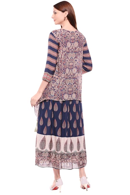 Blue midi dress with Madhubani printed motifs & asymmetrical overlap.
